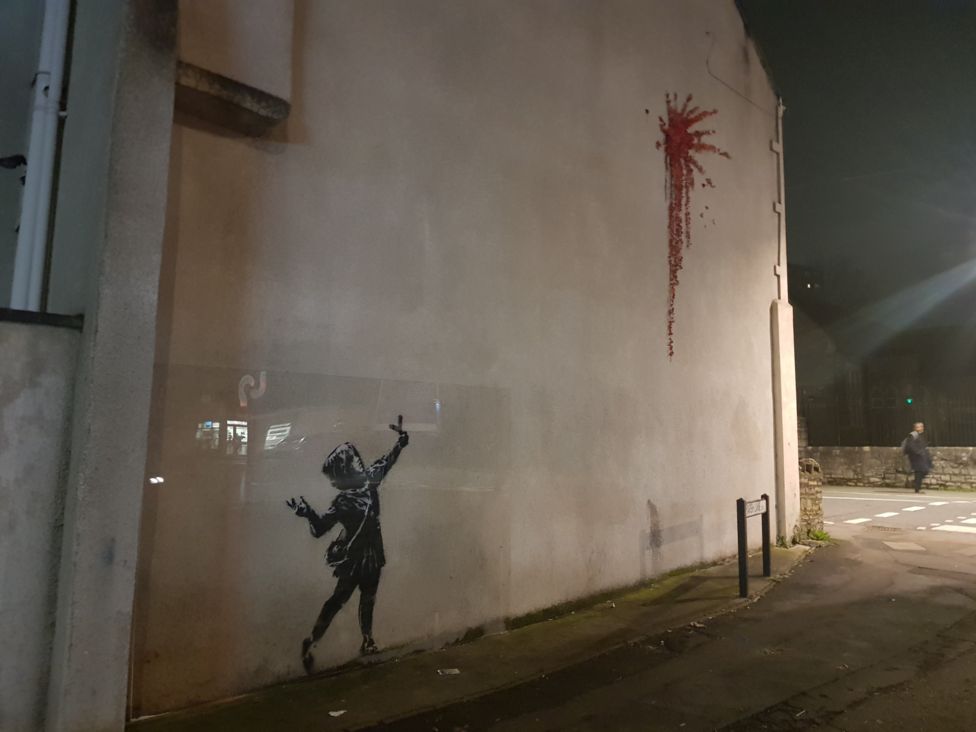 少女が花火のような赤い花をパチンコで発射している様子が描かれた壁画。花はバラの花びらとつたで作られているそう。「少女×赤」はバンクシーの代表作《Girl with Balloon》を彷彿とさせる。バレンタインデーの日に壁画が登場したことからも、バンクシーからのポジティブな愛のメッセージと捉えることもできる。しかし、一方でバラは「棘」があったり、垂れ下がった花びらは「血」を連想させたりもして、見方が広がる作品だ。