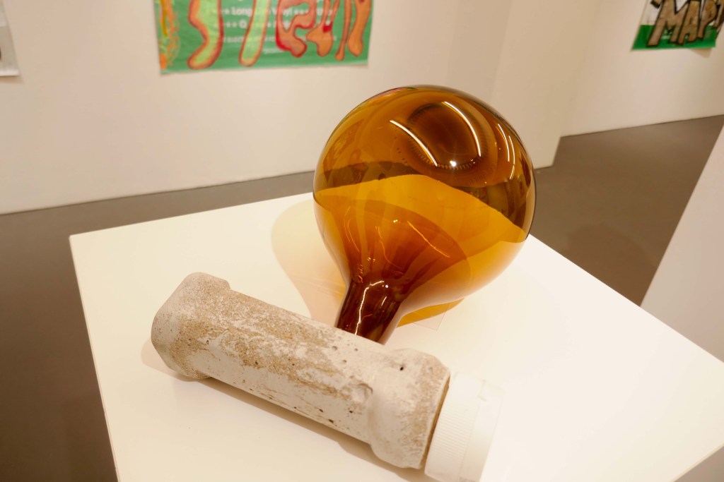 ビール瓶はスウェーデンにいる日本人のガラス作家、ヨーコ・アンダーソン・ヤマノが吹いたガラスで、その先端にある物体は、ロンドンのテムズ川の砂で鋳造したイギリスのHPソース(日本でいうブルドックソース)の容れ物。ソースはいくつものスパイスが配合されて作られており、それは魚が海を泳いで国境を渡っていくように、スパイスも様々な国からやってきている。アート作品も色んな人に出会ってキーワードを結びつけながら、ひとつの作品になっていることを表現しているのだ。