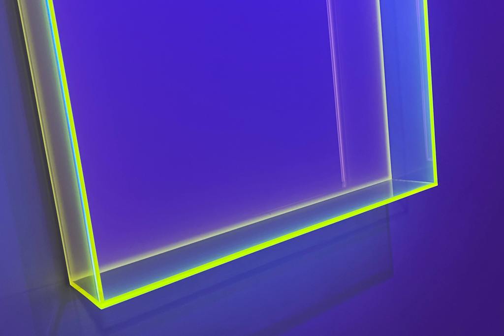 また、白色灯の下ではクリアで淡い色合いに見える彼女の作品だが、ライトがブラックライトに切り替わると、その表情は一変する。アクリル板に封入された顔料が「蛍光」を発し、まるでネオンサインのようにカラフルで明るく光る。蛍光灯下で見えた色の重なりとは全く異なる雰囲気となり、会場全体の空気感までも一転させる。