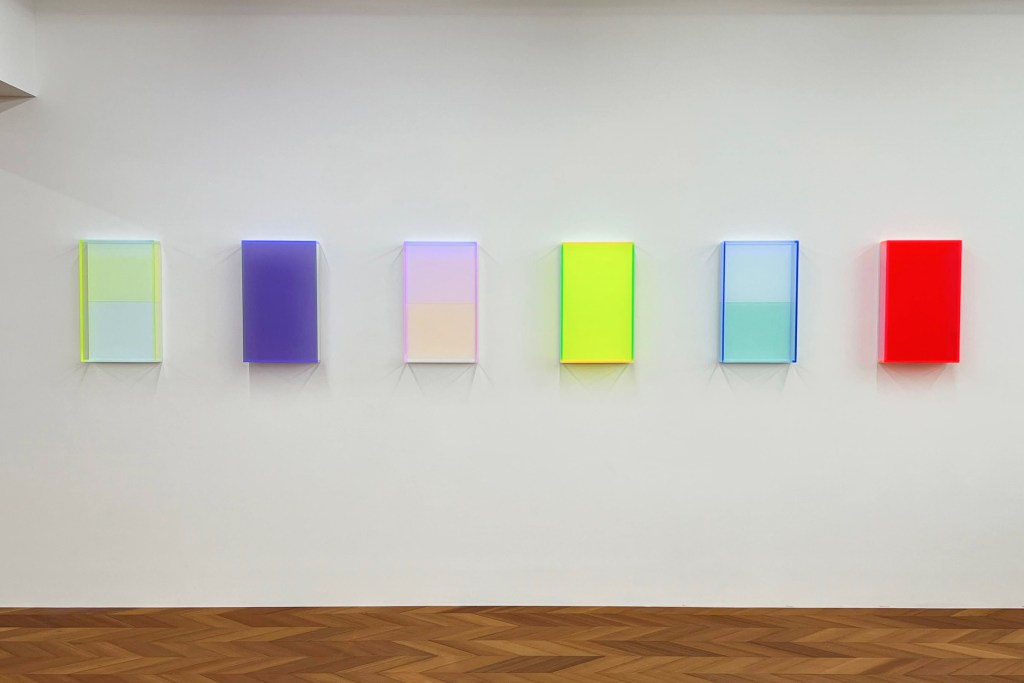 形状はとてもシンプルながら、その直方体は複雑に表情を変える。作品を構成しているアクリル板は、製造業者との共同研究によって産み出されたものであり、混入させる顔料の種類や量を変えることで、光の反射・吸収の度合いを調整している。こうしたアクリル板を組み合わせているため、見る角度を変えると色の重なり合いや表面の反射によって、多様な色彩に変化して見える。