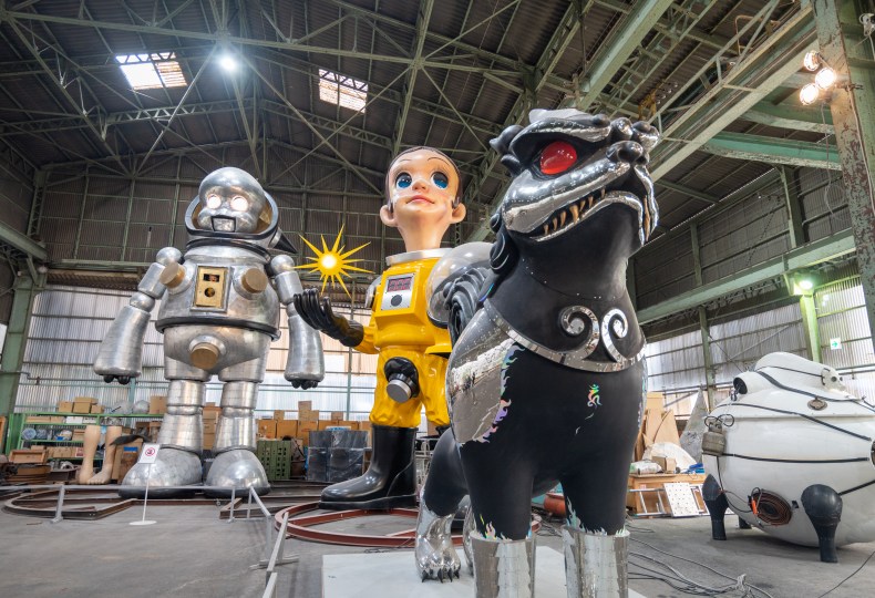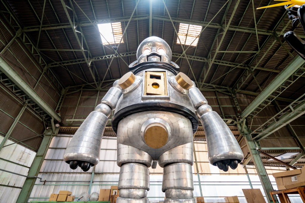 会場の一番奥のスペースでありながらも強い存在感を放つのは、最初にこの倉庫の利用を始めたというヤノベケンジの作品だ。1990年初頭より、「現代社会におけるサヴァイヴァル」をテーマに実機能のある大型機械彫刻を制作してきたヤノベ。この展示では、歌って踊って火を噴く体長7.2mの巨大ロボット≪ジャイアント・トらやん≫をはじめ、東日本大震災の復興への願いを込めた《サン・チャイルド》、世界遺産・比叡山延暦寺に奉納展示された ≪KOMAINU -Guardian Beasts-≫ 等の存在感のある作品が並ぶ。