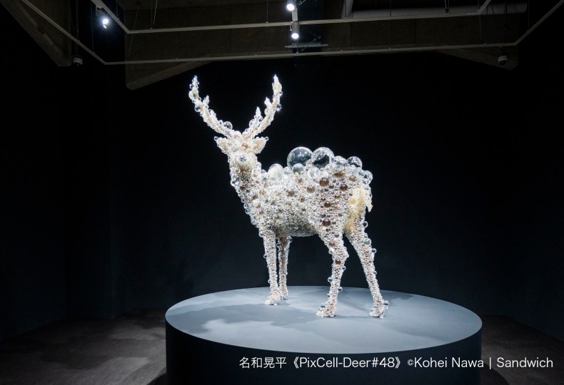 「森の中の鹿」をコンセプトに、名和の率いるSANDWITCHと協力してつくりあげたという展示室は、真っ黒な空間の中から、光りをまとった作品が浮かび上がってくるようだ。360°から見ることができるので、是非ぐるりと一周、その光の変化を楽しんで欲しい。