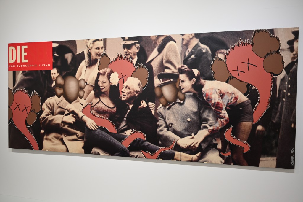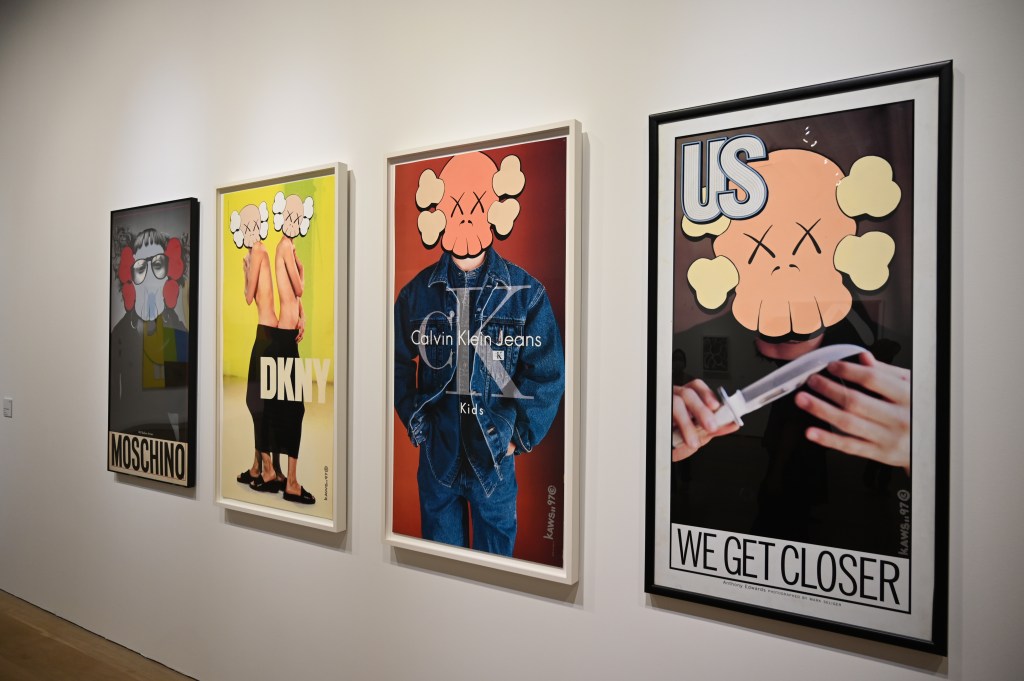 中でも目を引くは、DIESELの広告にアレンジを施した1998年の「 UNTITLED(DIESEL)」 。「DIE(死)」という言葉が象徴するように、KAWSのキャラクターが見えない死神のように描き添えられ、彼ならではのブラックユーモアによって生と死を考えさせられる。またアニメーターとしての経歴をダイレクトに反映させた、アニメーション映画をモチーフにしたような表現もあった。