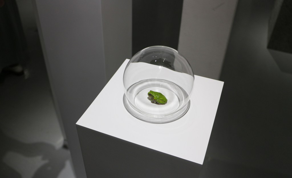 今回、多くの作品で「プラスティネーション(Plastination)」という技法が用いられました。加工肉を詰めた《Meat in a Cell》(2025)や鶏頭をガラス瓶に刺した《Cockscomb》(2025)、カエルがガラスドームの中に鎮座する《Frog》(2025)シリーズなどが展示されています。本来は変化を続けていくはずの有機物の時の流れが静止し、独特な印象が際立ちます。