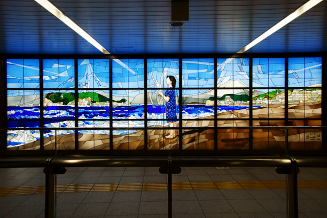 2008年に開業した東京メトロ副都心線。池袋駅から8駅にパブリックアートが設置されており、終点の渋谷駅にあるのが本作だ。洋画家の大津英敏が原画を担当し、娘・香織がモデルを務めた。富士山を望む七里ヶ浜の海景は、人々がせわしなく行き交う雑多な改札付近で、オアシスのような存在となっている。