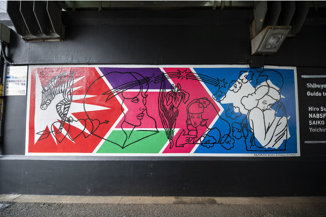 JR東日本の高架下をくぐる途中で目につくのが、伊藤陽一郎氏、大竹彩子氏、 NABSF氏、ヒロ杉山氏の計4名のアーティストによる、ペインティング。こちらは「シブヤ・アロープロジェクト」の一環で、渋谷区の一時避難場所(青山学院大学、代々木公園)の位置を外国人を含めた多くの来街者に認知してもらうために、日頃から人々の注目を集めるという目的で描かれたもの。高架下の目立たない場所にありながらも、緊急時にどちらの方向に避難すればよいかわかる「矢印サイン」がパッと一目で認識できるもが嬉しい。言葉の壁を超えて、誰もが理解できる矢印をわかりやすく盛り込んだアートは、いざという時に「記号」が役立つことを示唆しているようだ。