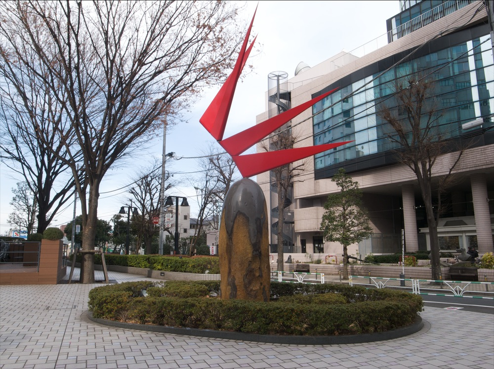旧こどもの城跡地の隣に凛と佇む《石に咲く花》は、石の上から伸びている赤い花をモチーフにした幾何学形状のパーツが、風によって回転するという、ユニークな仕掛けとなっている。身の回りに当たり前にある空気の存在を提示するために、モノが風に反応する様子の作品を多く製作している作家・高田洋一による本作は、そこはかとなく道端に咲いている花のイメージをガラリと変えてしまうような、実に力強い作品である。