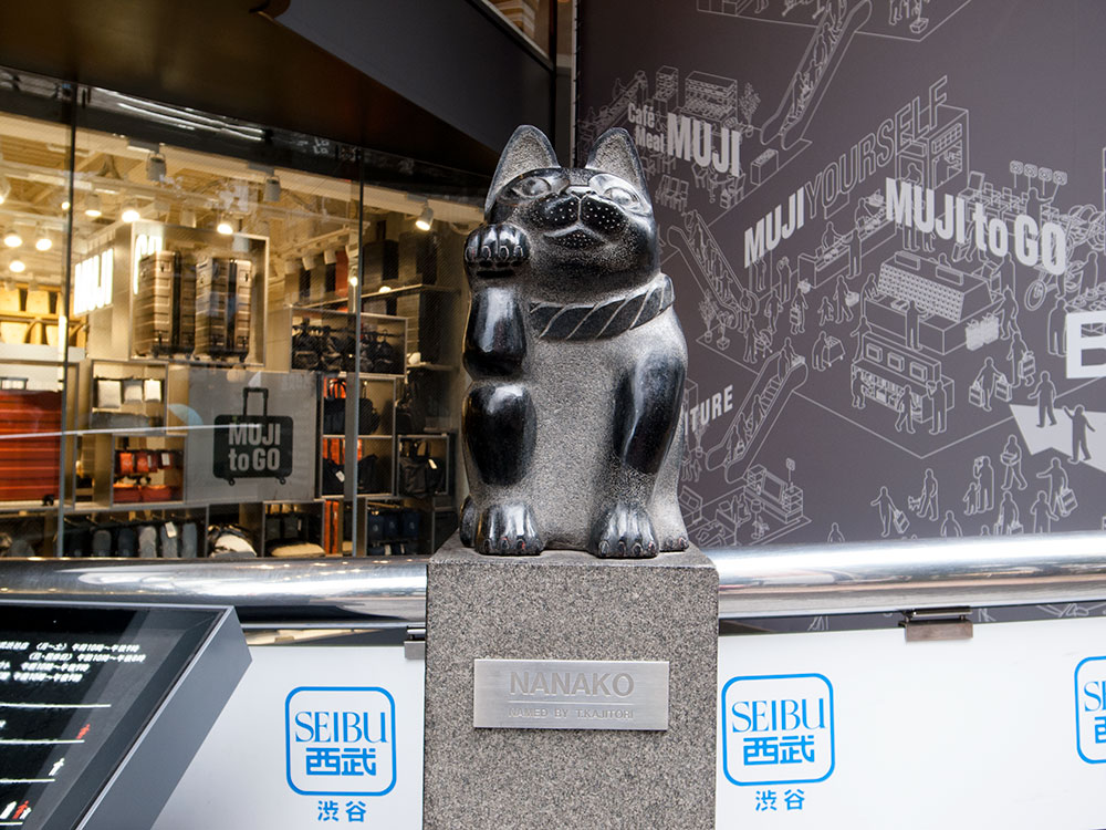 大阪出身の彫刻家・河合隆三が制作した、招き猫のようなキュートな像。西武渋谷店Movida館の開館に合わせ、1986年に設置された。作品タイトルは一般公募で、渋谷の定番待ち合わせスポット「ハチ公」にちなみ、「ナナコ」と名付けられた。知名度ではハチ公に劣るものの、公園通りの看板猫として愛されている。