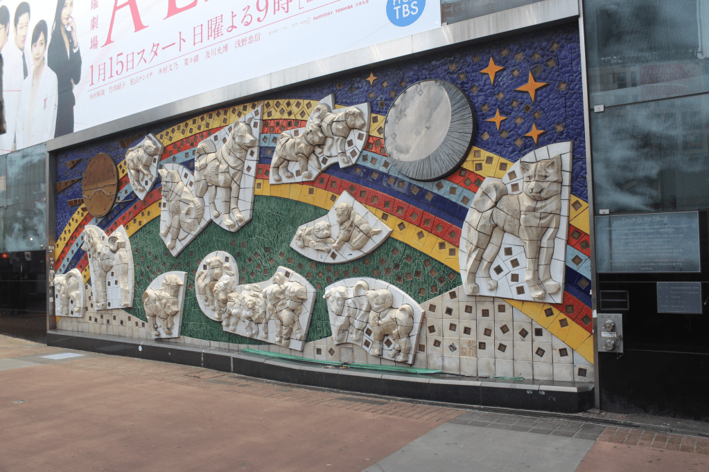 渋谷のシンボルとも言えるハチ公をモチーフにしたパブリックアートはいくつかあるが、本作ではその家族が登場する、たて4m×よこ15mの大型の陶板壁画となっている。待ち合わせ場所に指定されることも多いので、渋谷を訪れたことがある人なら一度は目にしているのではないだろうか。壁画にはハチ公の子供「クマ公」がいた事実に基づき、ハチ公の大家族20匹が描かれている。