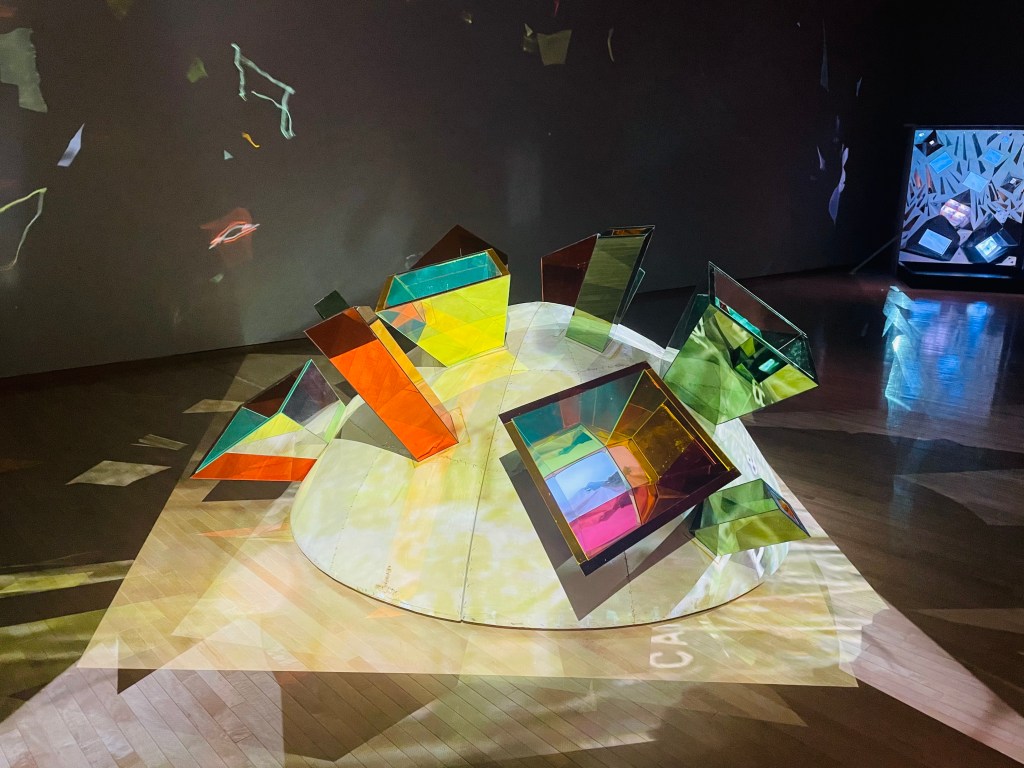 本セクションでとくに印象的だったのが、《河》(部分)。こちらは折り紙の笹舟を模した金属彫刻の中の水が波打ち、そこに逆さ吊りにされたモニターの映像が映り込んで絶えず揺れ動く様子を表現した作品である。