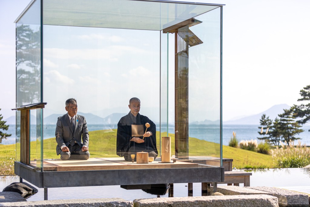 全面が無色透明な硝子で出来た一辺約2.5mの立方体の茶室。2014年のヴェネツィア建築ビエンナーレ関連展のために制作された後、2018年にベルサイユ宮殿、そして2020年に京都と旅を続け、直島が永住の地となる。