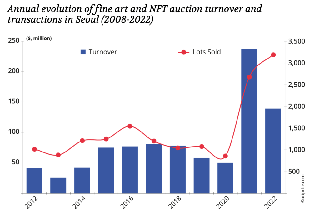 22年、韓国のアートオークション市場は1億3900万ドル(約183億円)で終了。21年に売上高が約5倍に増加し、アジア市場の新しいハブとして台頭した韓国だったが22年は減少。しかし、パンデミック前の2019年以降では140%増という成長を見せている。