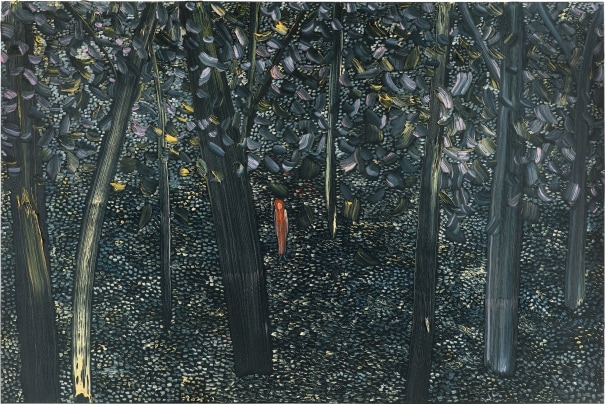 夜の暗い色調の中に淡い光が点描で描かれ、月光の薄明かりで浮かび上がるような幻想的な空間の広がりを見せ、覗き込むものを引き寄せる。木々の中に描かれた孤独な人物が印象的な作品。