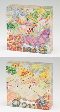 ロッカクアヤコは、1982年千葉県生まれの現代アーティスト。今回のオークションは1、2番をロッカクアヤコが占め、その高い人気がよく現れた結果で終了。ロッカクアヤコも2006年の「GEISAI」でスカウト賞の受賞をきっかけに注目を集めるようになり、トレードマークの大きな瞳の少女と、少女を包む柔らかさと力強さが同時に存在するような明るい色彩で見る人を魅了している。本作は、それぞれに描画された5枚のアクリルを張り合わせ、表と裏で違う絵柄を楽しめる作品。