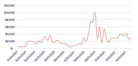 NFTアートの平均価格は、1年間で約10倍に跳ね上がった。2021年初頭には3.3万円(300ドル)前後だった価格が、8月頃のピーク時には111万円(1万ドル)を超えている。ピークが過ぎ、年末には33万円(3千ドル)前後に落ち着いた。