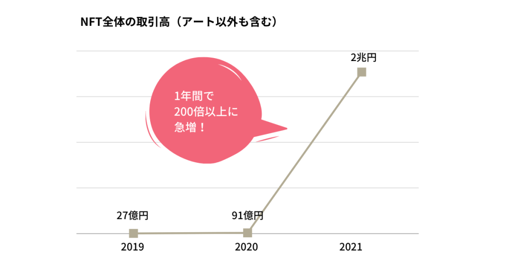アート以外も含めたNFT全体の取引高は、2020年度には約91億円(8,200万ドル)だったが、2021年度は約2兆円(176億ドル)に。200倍以上の増加を見せた。