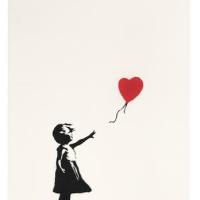 バンクシーの代表作の一つである本作は、イスラエルとパレスチナを分断する壁に登場した壁画で、別名「Flower Thrower」とも呼ばれている。過激派に扮した青年が手榴弾や火炎瓶の代わりに「花束」を投げ入れる姿を描いたこの作品は、《Girl with Balloon》と並んでポジティブな表現で反戦を訴えた人気作品。今回落札されたのは、サインなしのエディション500の作品。(予想落札価格:約800万〜1,400万円)