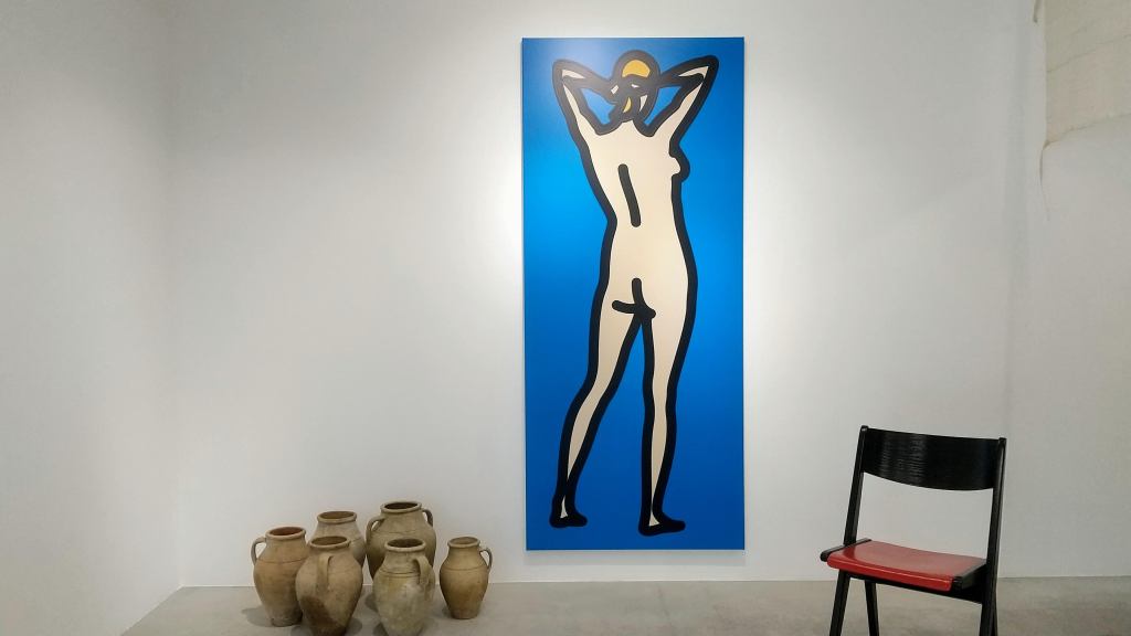 特に、本展でも作品が展示されている「ジュリアン・オピー」は、MAHO KUBOTA GALLERYの看板アーティストだ。真っ青の背景に最小限の線で描かれた裸婦画は本展でもひときわ存在感を放っている一作。自身も古代エジプト美術やビザンティン美術、浮世絵等幅広い分野のコレクションを所有し、それらからインスピレーションを得ているというオピーの作風は、本展の「過去と未来の調和」のテーマにも通ずるものがあるのではないだろうか。