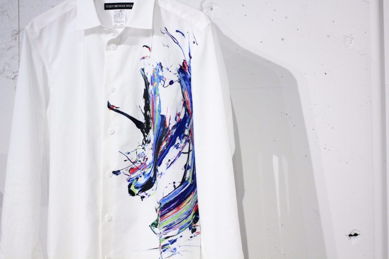 山口歴が行ったコラボの中でも代表的なのが、2017年に「ISSEY MIYAKE MEN」と行なった、‟OUT OF BOUNDS”シリーズのリリースだろう。‟OUT OF BOUNDS”シリーズをモチーフに、シルクスクリーンで幾重にも染料を重ねて顔料を組み合わせることで凸凹感と光沢を表現したというシャツをはじめ、転写プリントが施されたデニム、さらにインクジェットプリントの大判ストールや花モチーフのカットソーまで、個性的で多彩なアイテムが出揃った。