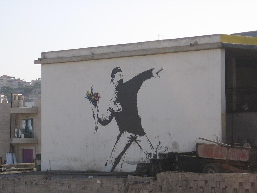 《Flower Thrower》(「Love is in the Air」とも呼ばれる作品)は、イスラエル軍の軍事占領と攻撃に投石で抗議したパレスチナの抗議運動をモチーフにした作品。パレスチナにあるベツレヘムという街の建物の壁面に描かれ、イスラエル側へ「石」ではなく「花束」を投げる構図で描かれている。これは、バンクシーがパレスチナ人の権利を主張して制作したものであり、初期の代表作のひとつに挙げられる作品だ。