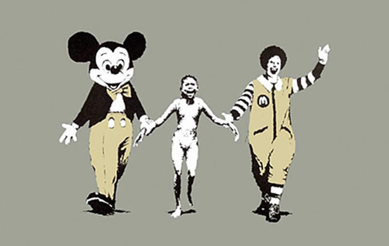 アメリカの資本主義を象徴するキャラクターを描いたこの作品もよく知られている。中央の少女は、1973年度ピューリッツァー賞を受賞した写真から取ったイメージ。ベトナム戦争の最中、米軍の命令でナパーム弾を落とされた村で、逃げ惑う人々を撮影したものだ。バンクシーの強い反戦のメッセージがうかがえる。