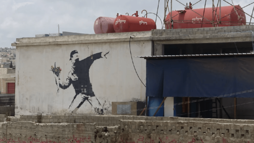 《Love is in the Air》で「愛は空中に」を意味するこの作品(または「Flower Thrower」とも呼ばれている)は、2003年パレスチナのベツレヘムにある建物の壁に描かれた。イスラエルの軍事的支配に対して、パレスチナ市民が石や火炎瓶を投げて抵抗する運動「インティファーダ」がモチーフとなっていて、バンクシーは愛の象徴とも言われる「花束」に置き換えることで反戦争を訴えている。バンクシーの中でも政治的でありメッセージ性の強い作品の一つだ。