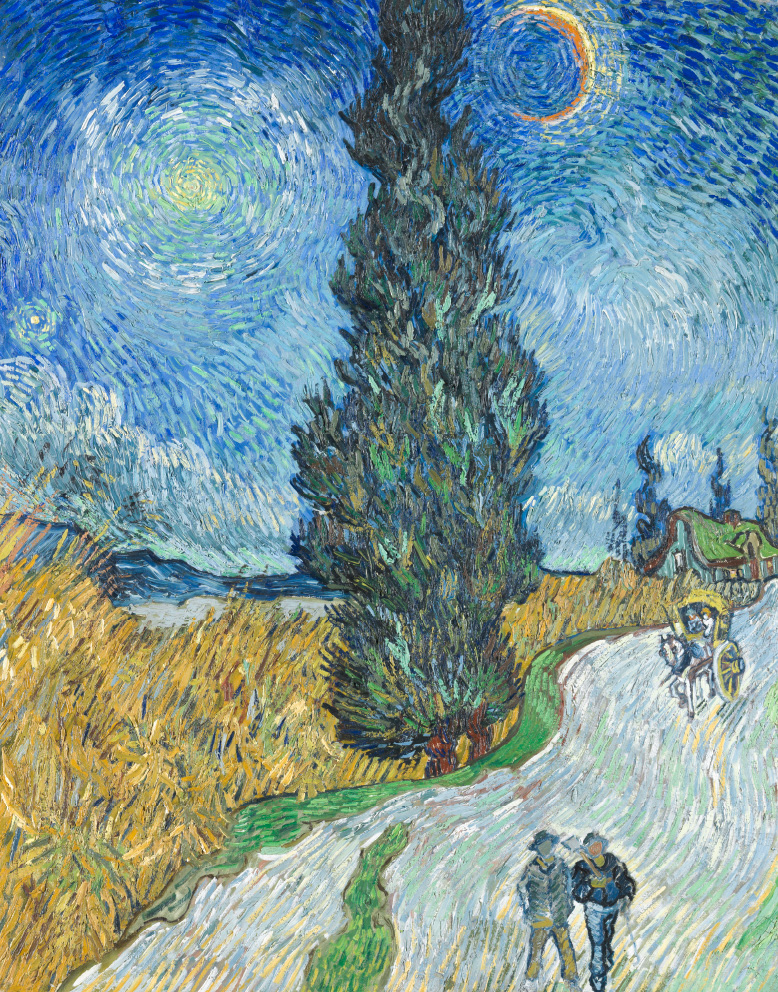 糸杉はその樹齢の長さから「生命」や「豊穣」のシンボルとされる。一方で、イエス・キリストが磔にされた十字架は、糸杉で作られたという伝説があり、欧州・欧米では「死」の象徴ともされている木だ。ゴッホは糸杉を「生と死の架け橋」として表現し、当時のゴッホの不安定な精神状態が渦巻きに現れているのではないかとの考察がある。《糸杉と星の見える道》(または《夜のプロヴァンスの田舎道》とも呼ばれる)は、療養所で描いた最後の作品。