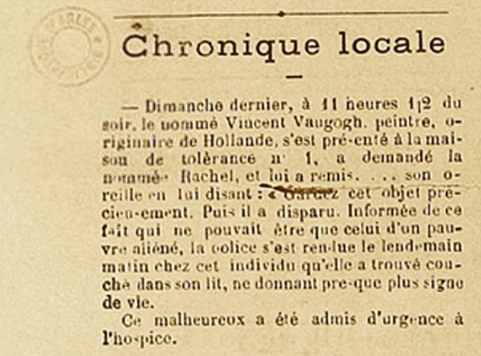 ゴッホとゴーギャンは、互いの強烈な個性がぶつかり合う性格の不一致で、10月から始まった共同生活を2ヶ月で終えることになる。最後まで口論が続き、1888年12月23日、ゴッホは自ら左耳を剃刀で切り落とした。そしてその後、ゴッホは娼婦の元へ行き、「この品を大事にとっておいてくれ」と自分の耳を渡し、その場を去ったという。切り落とした理由は諸説あるが、ゴーギャンがゴッホの自画像の耳をからかったからではないかと言われている。ゴッホはそれから度々発作を起こし、アルルの市立病院で入退院を繰り返した。