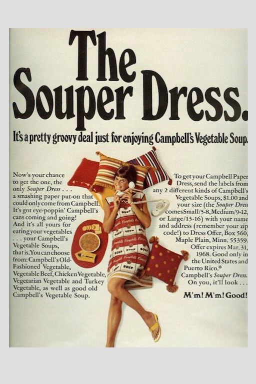 ウォーホルは1960年代半ばに、《キャンベルスープ缶》をペーパー上にスクリーン印刷した「Souper Dress」を発表した。このドレスは1960年代にアメリカで「ペーパードレス」が流行した際に、キャンベル・スープのキャンペーン広告として制作されたものである。ペーパードレスは文字通り「紙製のドレス」。コストパフォーマンスに優れる一方で、「使い捨て」を象徴する時代のアイコンでもあった。