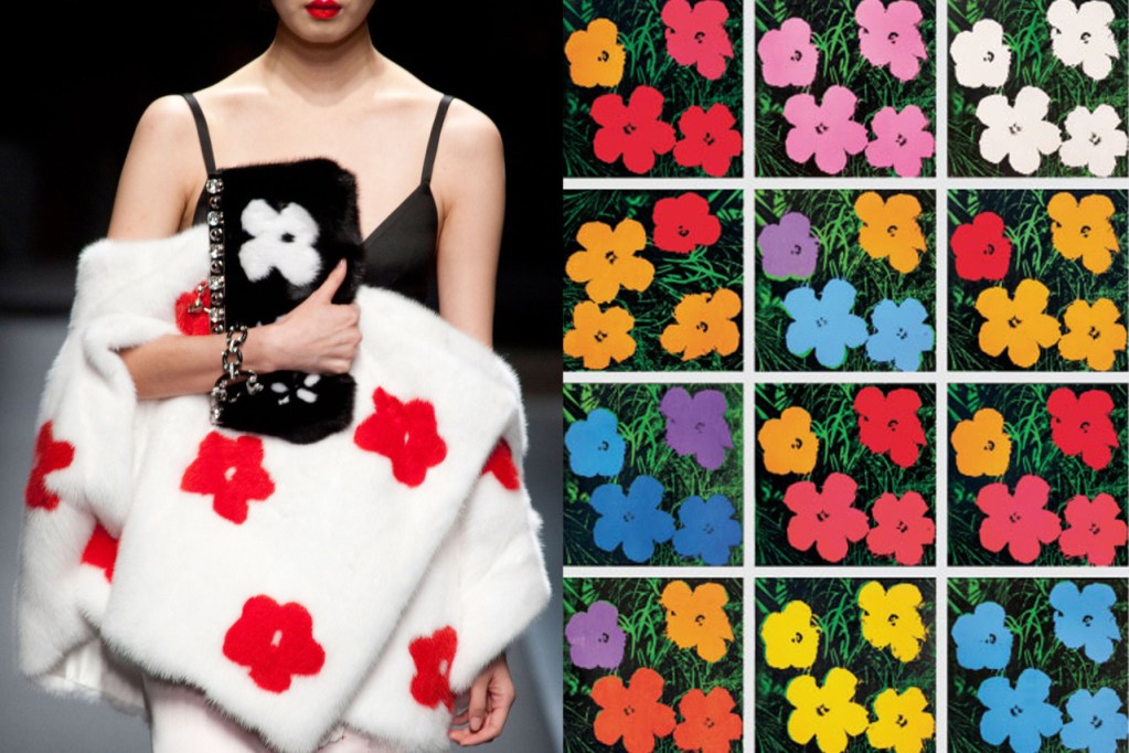前述のディオールのショーと同年、2013年のPRADA(プラダ)のコレクションでは、白のファーコートや黒いサテンのコートなどに、ウォホールの名作「花」が大胆にあしらわれた多数のアイテムが登場した。プラダらしいシンプル&シックなムードの中に、鮮やかな花が舞うキュートなルックスが印象的。