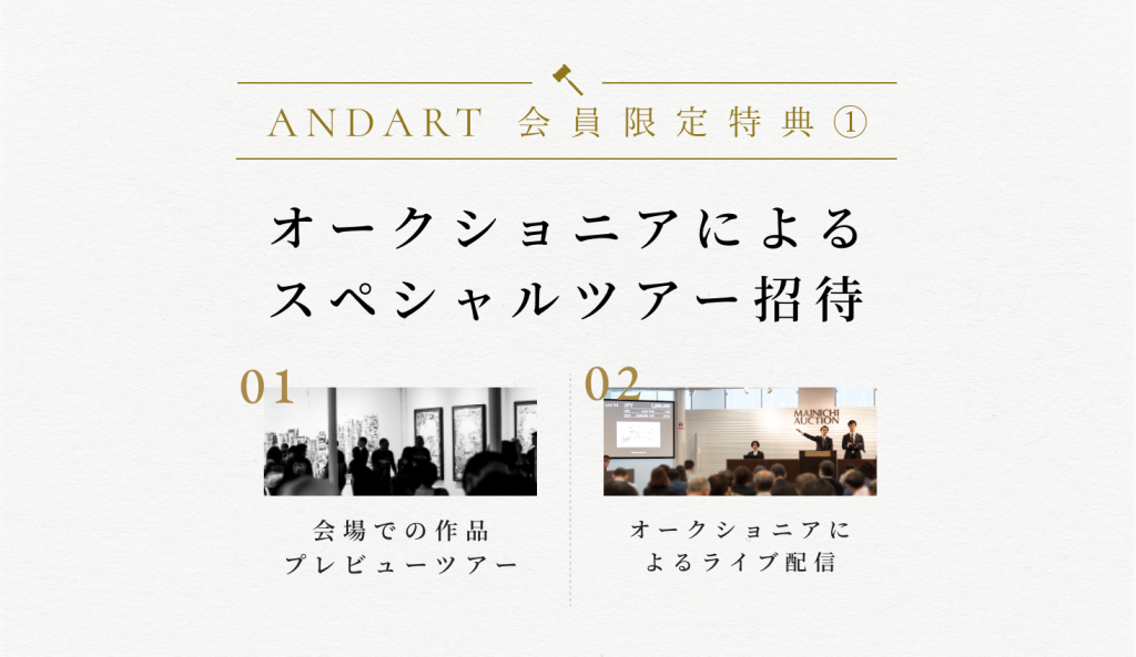 ANDARTは敷居が高いとされてきたアートの世界と多くの人が繋がり楽しめる世界を目指し、より多くの方がアートに触れるきっかけを創出していきたいと考えています。今回は、リアルタイムで作品への入札が飛び交い、アートへの熱狂を感じていただける場であるアートオークションの魅力を楽しんでいただけるよう、毎日オークションのご協力のもと、オークションに初めて参加する方でもお楽しみいただけるような会員限定の特典をご用意いたしました。この機会に、楽しみながらアートオークションに参加してみませんか?