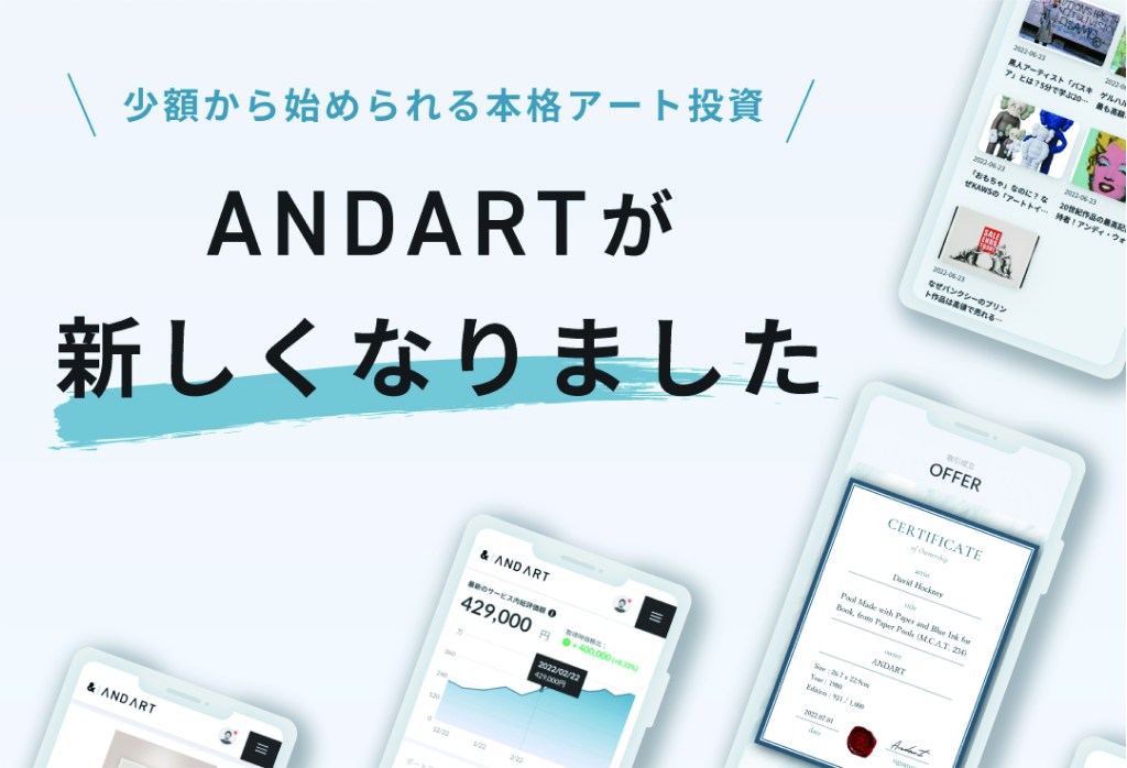 2022年7月に3周年を迎える「ANDART」が、「アートの小口投資プラットフォーム」としてリニューアルしました。サービス開始時からアートの共同保有をコンセプトに提供されてきた「ANDART」は、高まる資産形成としての需要に応え、所有権が小口で購入できる体験に加え、アート投資の体験をさらに楽しめるサービスへと生まれ変わりました。