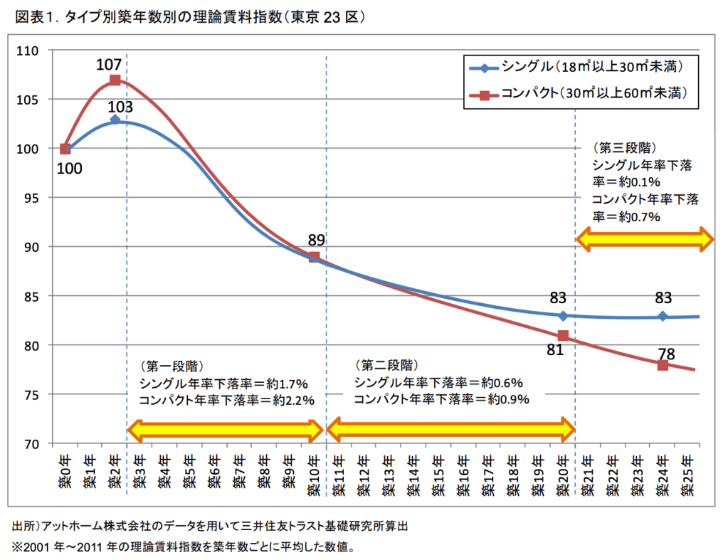 上記を見るとわかるように、築3年〜築10年が一番下落幅が大きく、ワンルームに代表されるシングルタイプは築20年以降の下落が抑えられていることが分かります。