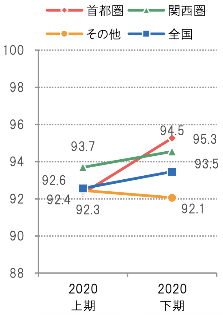 2016年下期からの推移を見ると、首都圏ではだいたい92%〜95%前後、関西圏は首都圏よりも振り幅が大きく92%台から96%台、その他の地域は首都圏や関西圏よりも低い数値で推移しています。