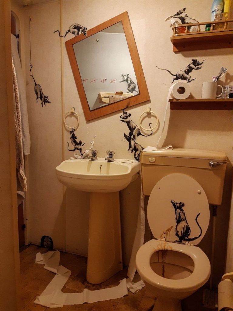 ロックダウン中の彼の活動をテーマから振り返ってみると、イギリスの国民皆保険医療システムのNHSに寄贈した『Game Changer』のように、コロナ禍を背景とした作品、そして、コロナと時を同じくして世界的な社会現象になったブラック・ライブズ・マタ−(BLM)をテーマにした作品、長引くシリア難民問題をテーマにした作品がある。今まさに起こっている社会的関心に対する即座な反応、口舌を緩めぬ警告には、ストリートアーティストとしての粘り強い意気込をみることができよう。その中で、ロックダウンという人の一生で前代未聞ともいえる状況だからこそ、表現者として内側からエネルギーが噴出した作品が2点あった。ひとつは、2020年4月、閉鎖が宣言されてから最初に公表された作品で、洗面所の壁にねずみたちが暴れ回る様子を描いたもの。もうひとつは、制限が一度解除された直後の同年7月に地下鉄の車両内に描かれたストリートアートとそれを記録した映像作品だ。