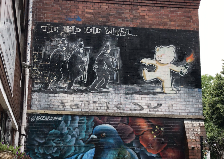 そのような過去を持ったブリストルは、今もさまざまな人種民族が共存する多民族都市だ。かつてコルストン像が立っていた場所から15分ほど北東に歩くと、ストーククロフト通りというエリアに入っていく。そのあたりは、特に有色人種やアイリッシュが多く住む地区で、これまで何度も平等と人権を訴えるデモ活動がおこり、時に暴動に発展した。地元民が食材や生活品を売る店が軒を並べ、所々に小さなカフェやインディペンデントショップが点在し、人々が助け合いながら生活している様子が伺える。バンクシーのブリストル時代の最後の代表作《マイルド・マイルド・ウエスト》(通称)は、そんな場所にある。バンクシー以外にも、たくさんのストリートアートやグラフィティで溢れている。