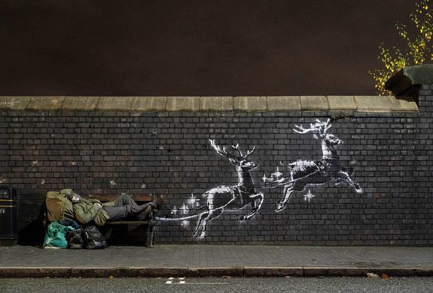 2019年12月に、バンクシーが鉄橋の黒壁に残した作品の映像を見ていると、ホームレスの老人のそんなセリフが聞こえてきそうだ。場所は、クリスマスの飾り付けが眩いバーミンガム中心部から少し離れた産業地区の路上。カメラは白ひげのホームレスがベンチに横たわる様子を映すやいなや、徐々にズームアウトしながら、今度はベンチの横に空駆ける二頭のトナカイを描いた壁の絵を捉える。柔らかな音色のクリスマス音楽を流し、その場限りの少しセンチなファンタジーを作っている。まるで、マッチ売りの少女を思わすような。