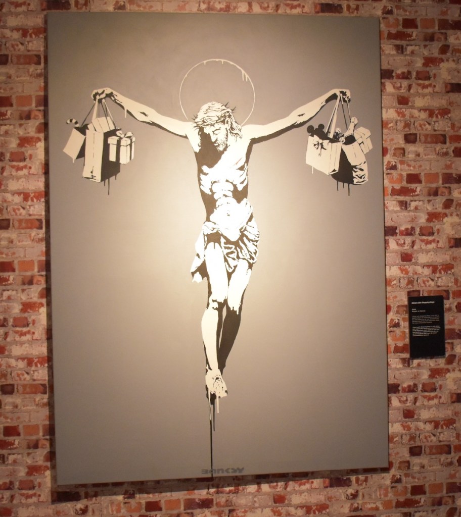 サンタクロースのモデルとなった聖ニコラスが貧しい家の三人の娘たちを救うために、三つの金の袋を与えた逸話も、クリスマスの精神性を象徴的に語っている。ところが、近年その根底にあった精神が薄れ、クリスマスプレゼントの習慣は形骸化し、クリスマスといえば、人々は過剰にショッピングに走る傾向が強くみられる。その裏には商業主義や大量消費文化が横たわり、大衆はコマーシャリズムに踊らされているというのも、広く言われている批判だ。かつてサンタズ・ゲットーで売られていたバンクシーの次の作品からも、ストレートで辛辣な警告が読み取れよう。